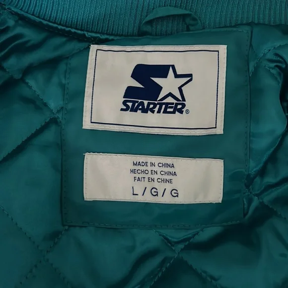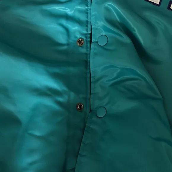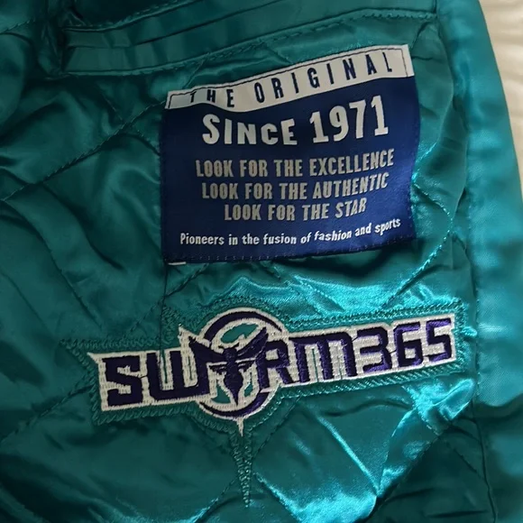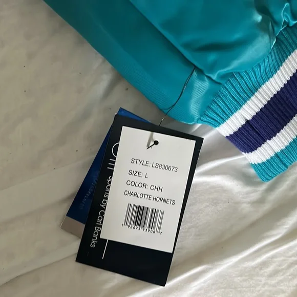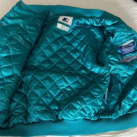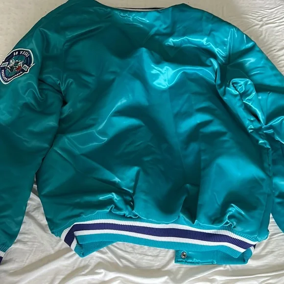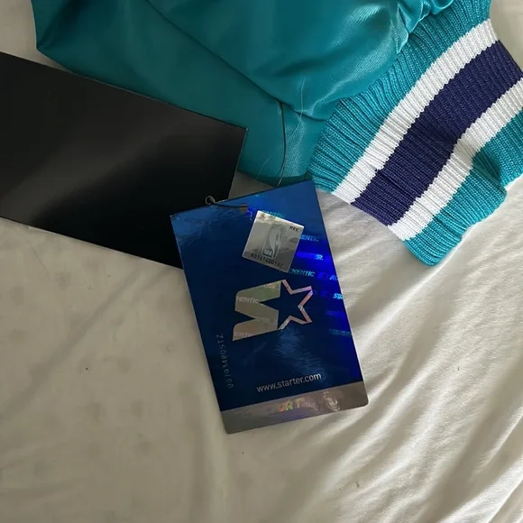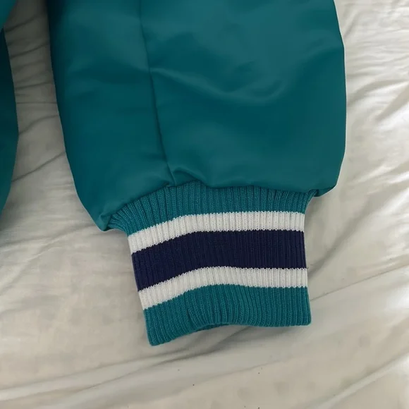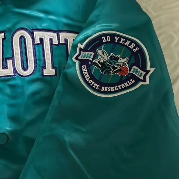 A Starter 30 year anniversary jacket of the Charlotte Hornets basketball team. Exclusive to members who are season-ticket holders at time of purchase. Rare. Unworn and the tags are still on. Color is teal with white, purple-bordered letting on, “CHARLOTTE.” A great gift for Hornet fans.