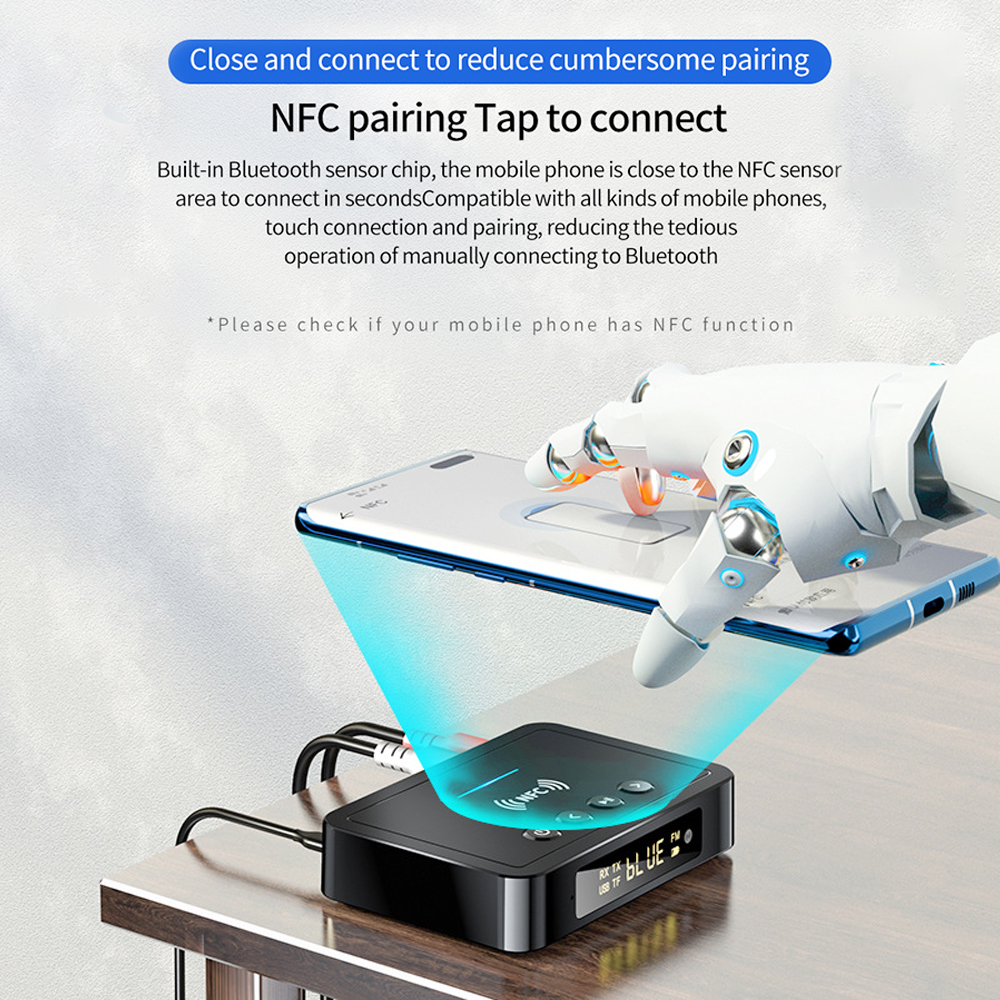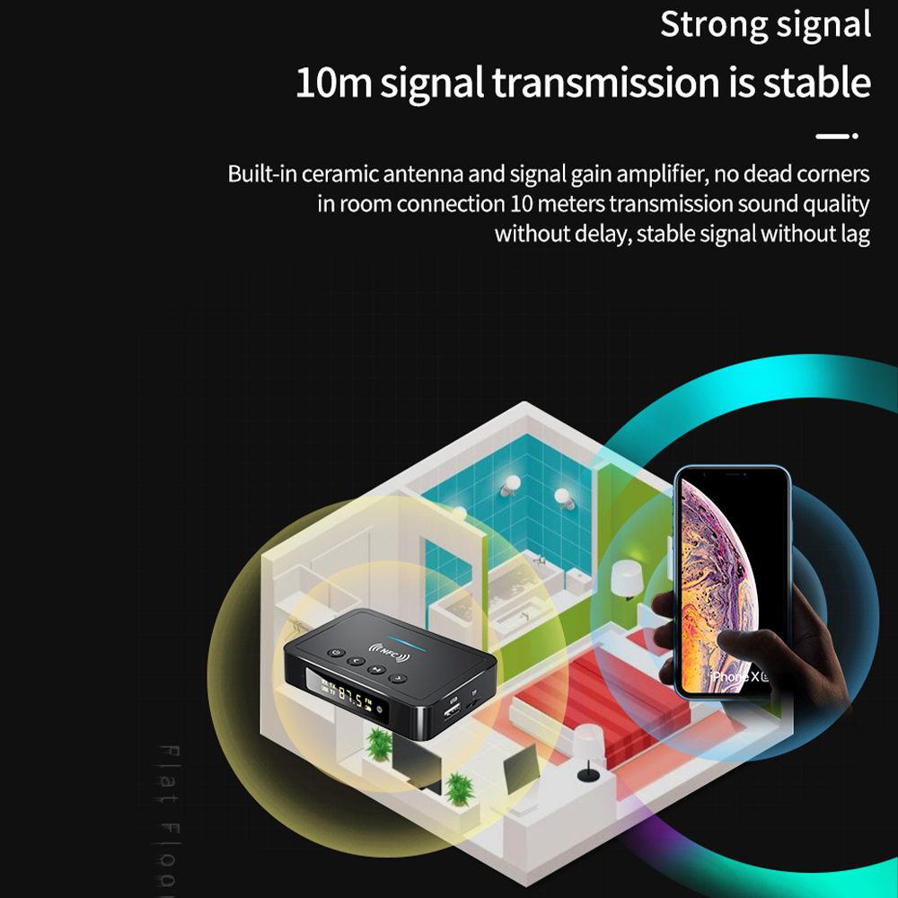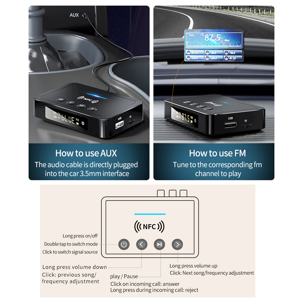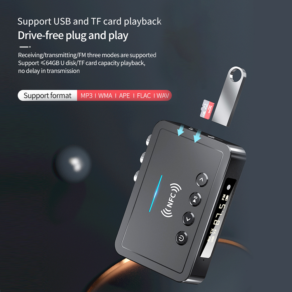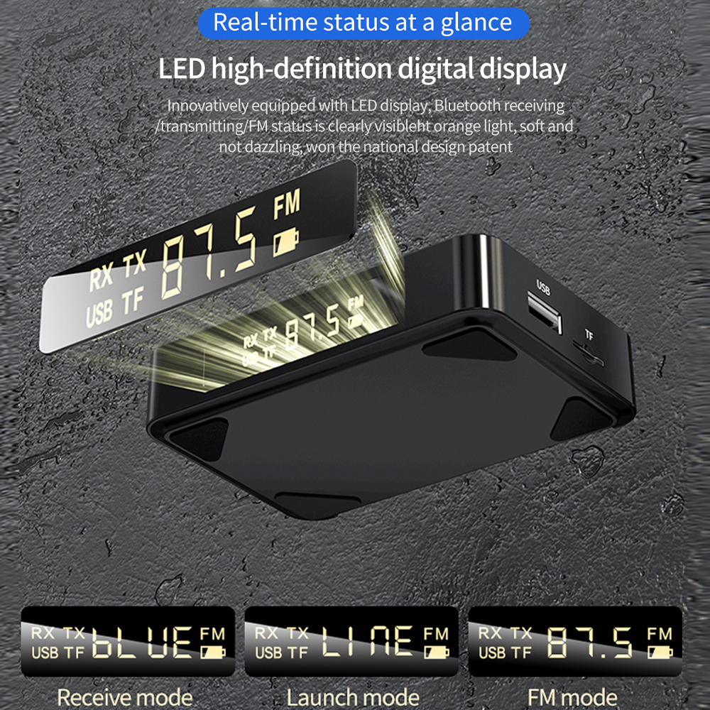 Bluetooth receiving (RX), Bluetooth transmitting (TX), FM transmitting three-in-one design.