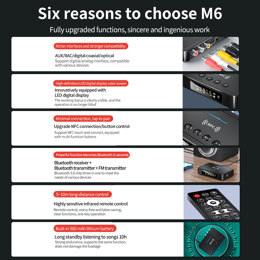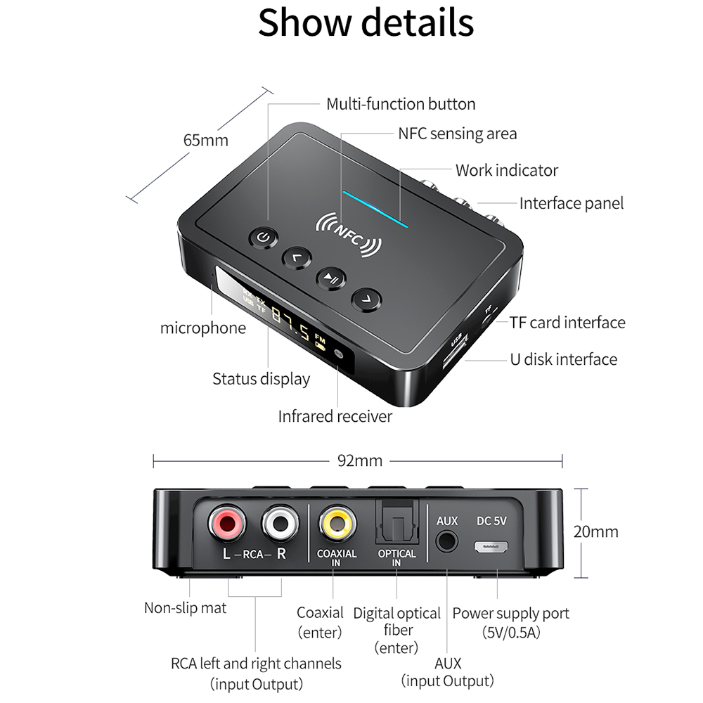 The function of the Bluetooth receiver is to add Bluetooth wireless function to the wired speaker/headphone, so that the Bluetooth-enabled device such as the mobile phone can be wirelessly connected to the wired speaker/headphone through the adapter.