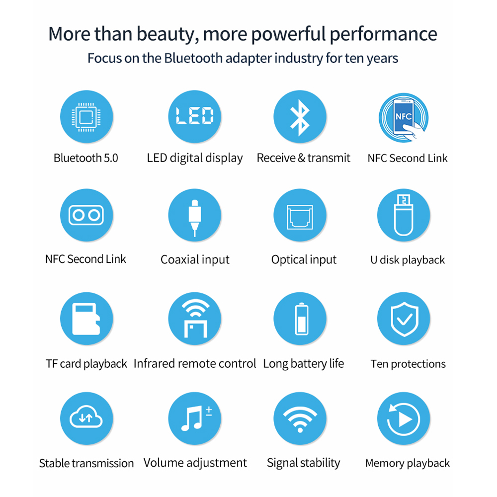 Compatible devices: Android, IOS mobile phones and Pads, active speakers, power players and Bluetooth speakers or headphones that support A2DP/ protocol.