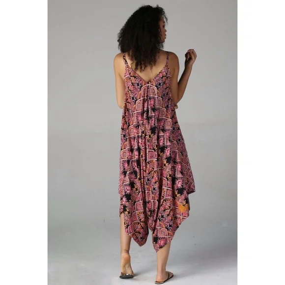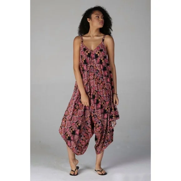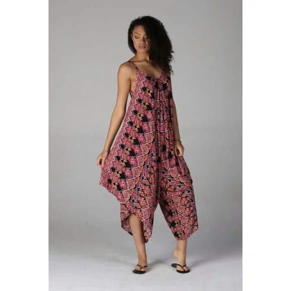 ANGIE Batik Print V Neck Sleeveless Slouchy Harem Jumpsuit CroppedJust as effortless as it is essential, this throw-on-and-go jumpsuit can be layered up or styled solo. This so cool piece is sure to be your top pick for any style, from season to season.FeaturesSlouchy, Loose FitBatik PrintSleevelessV Neck, Front & Back Dropped CrotchWide Asymmetrical Cut LegFabric100% RayonMade in India MeasurementsOur model is wearing the size smallSmall: Pit to Pit 38” | Total Length 50”Med: Pit to Pit 40” | Total Length 51”Large: Pit to Pit 42” | Total Length 52ANGIE Batik Print V Neck Sleeveless Slouchy Harem Jumpsuit Cropped