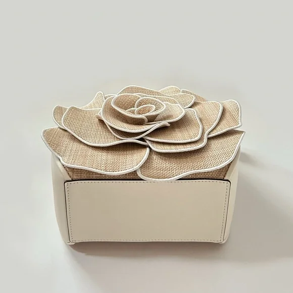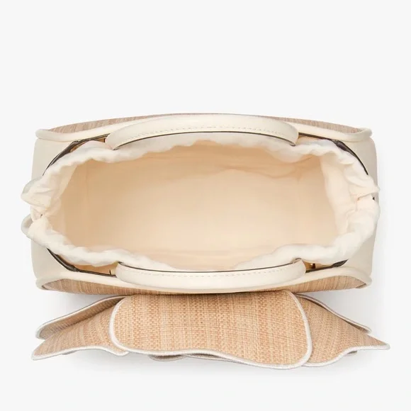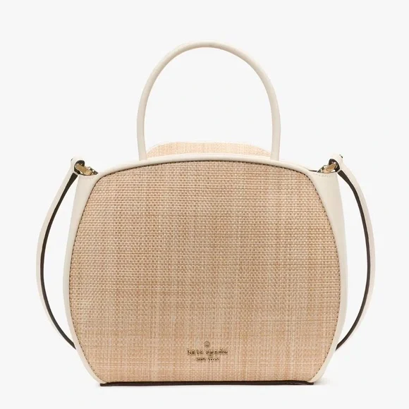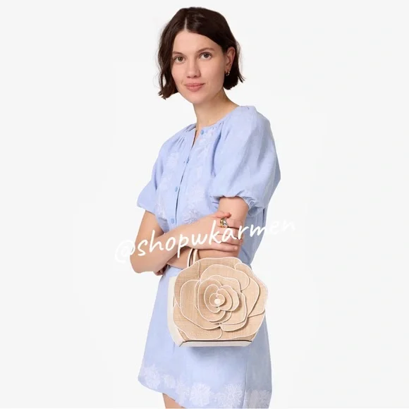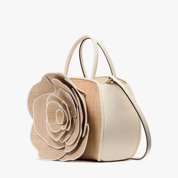 Authentic Kate Spade New York GuaranteedNWT Brand NEW with Tag3D Rose StatementWoven StrawMeringue Smooth Leather TrimMetal Pinmount Logo backDrawstring closurePlain Faille LiningLight Gold Toned HardwareDual Top Handheld Handles drop 3.5”Detached and Adjustable Crossbody Shoulder Strap Drop: 22"Size: 7" H x 4" D x 8.5"W (widest point)Color: Natural (250) UPZMSRP $449 plus taxKK969