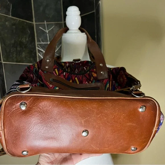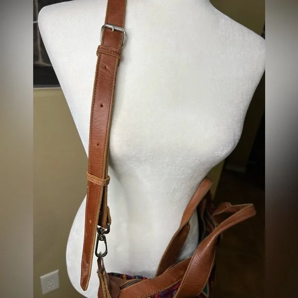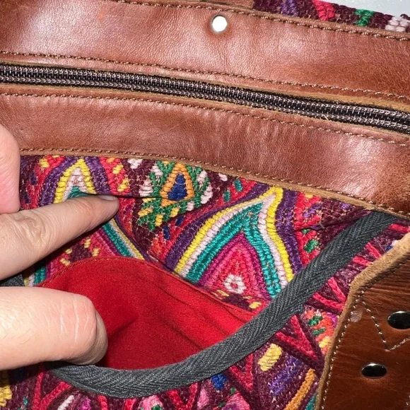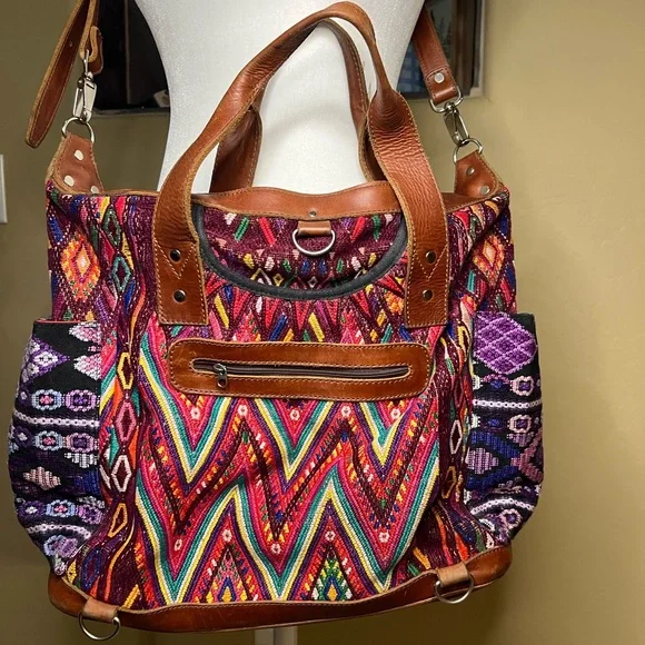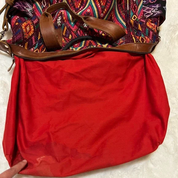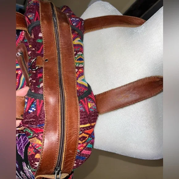 Gently used. The bag is missing the backpack strap comes with shoulder strap. And the bag does have some stains on the interior lining. The leather on the bottom of the bag has scuffs. Please review all photos. Wear is shown. Smoke free home Nena and Co. One of a kind Convertible Day Bag DETAILSGenuine full grain leather base, handles, removable shoulder straps, and removable cross body strap Handwoven, vintage huipil fabric body (Normal huipil pulls and love marks on the leather are possible)(there may be color variations due to studio lighting)100% red cotton liningMetal hardwareZip closureOne inner pocket, zip closureTwo outer pockets, one with zip closureTwo side pockets, magnetic snap closuresMade in Guatemala17”inches wide14” inches height