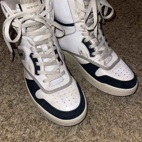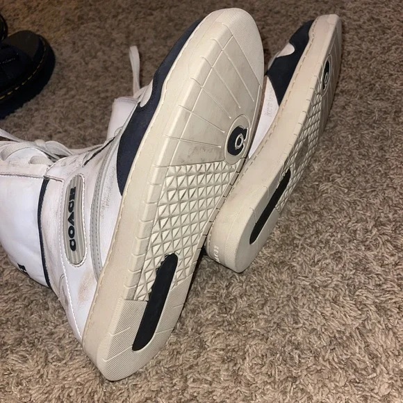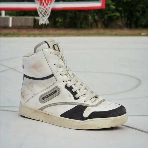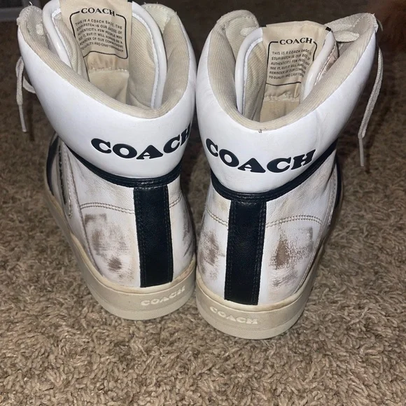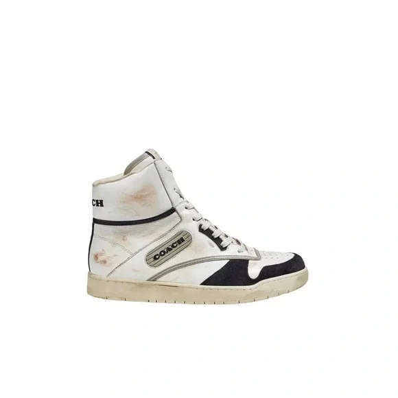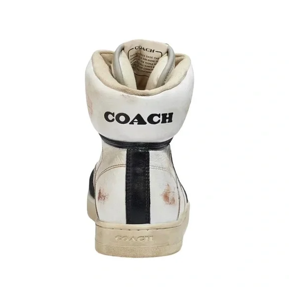 Elevate your casual shoe game with this rare and stylish pair of high top sneakers from COACH. Crafted with distressed leather and canvas, these sneakers are perfect for the fashion-forward man who wants to stand out from the crowd. The white color and leather lining add a touch of luxury to the sneaker, while the lace-up style ensures a secure fit. These COACH sneakers are perfect for men who value comfort and style. With a customized fit, they are ideal for everyday wear and can be dressed up or down. Whether you're running errands or going out for a night on the town, these sneakers will keep you looking and feeling your best.Perfect CHRISTMAS gift for any shoe lover!Retail is $275!!!