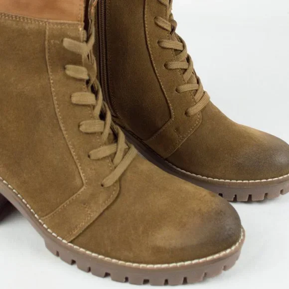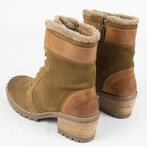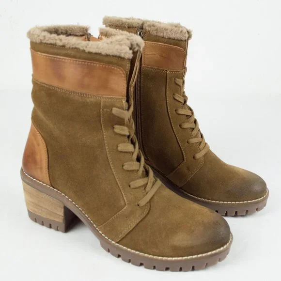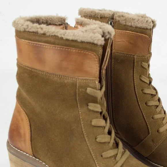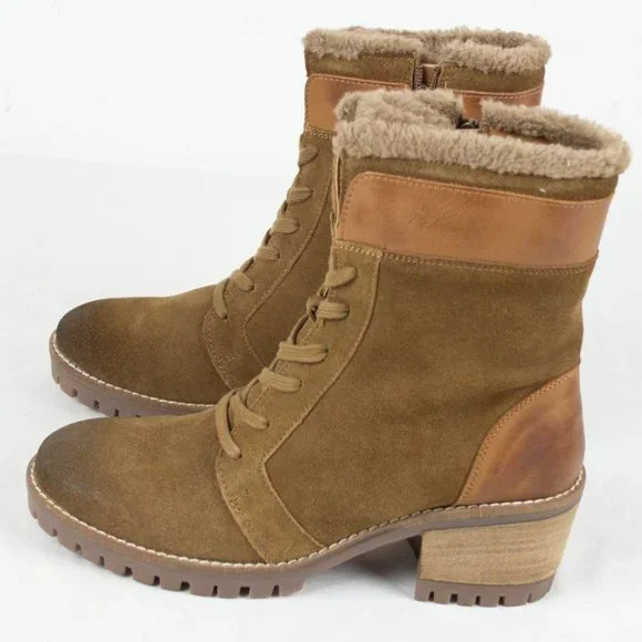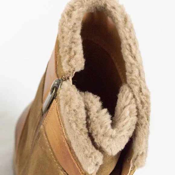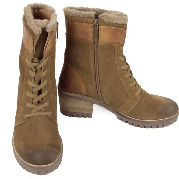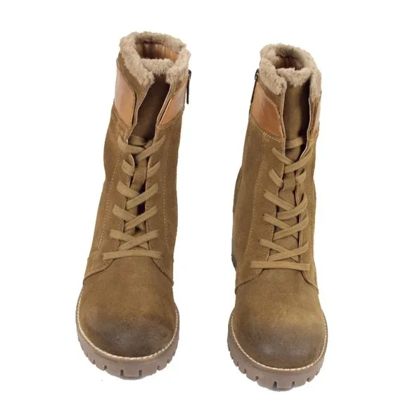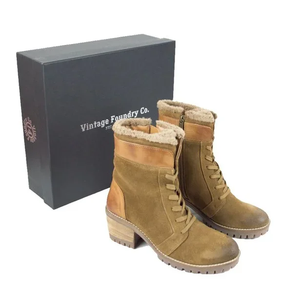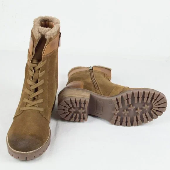 VINTAGE FOUNDRY Scarlett Faux Fur Trim & Suede Combat BootSizing: True to sizeSize: 9Color: COGNACGo combat, but make it elevated with allover suede, faux fur lining and a chunky heel. From your favorite jacket to distressed jeans, the Scarlett pairs perfectly with casual cool outfits for effortless style. ~ Round toe~ Lace-up vamp closure~ Suede construction~ Faux fur lining and trim~ Cushioned foot bed~ Stacked heel ~ Approx. 6" shaft height, 9" opening circumference - Approx. 2.5" heel Leather upper, 100% microfiber faux fur lining, manmade sole